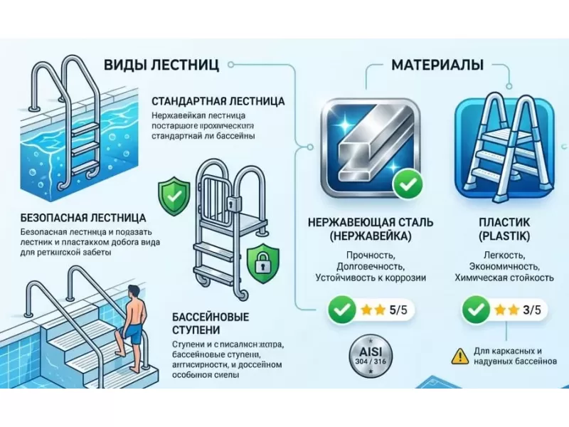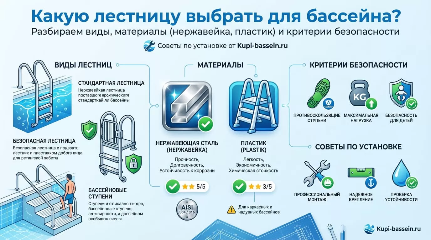 Выбор лестницы кажется простым, но на самом деле он зависит от типа чаши, материала и вашего бюджета. Команда Kupi-bassein.ru поможет вам сориентироваться в этом многообразии и выбрать модель, которая будет служить долго, выглядеть стильно и, самое главное, не подведет в самый ответственный момент.