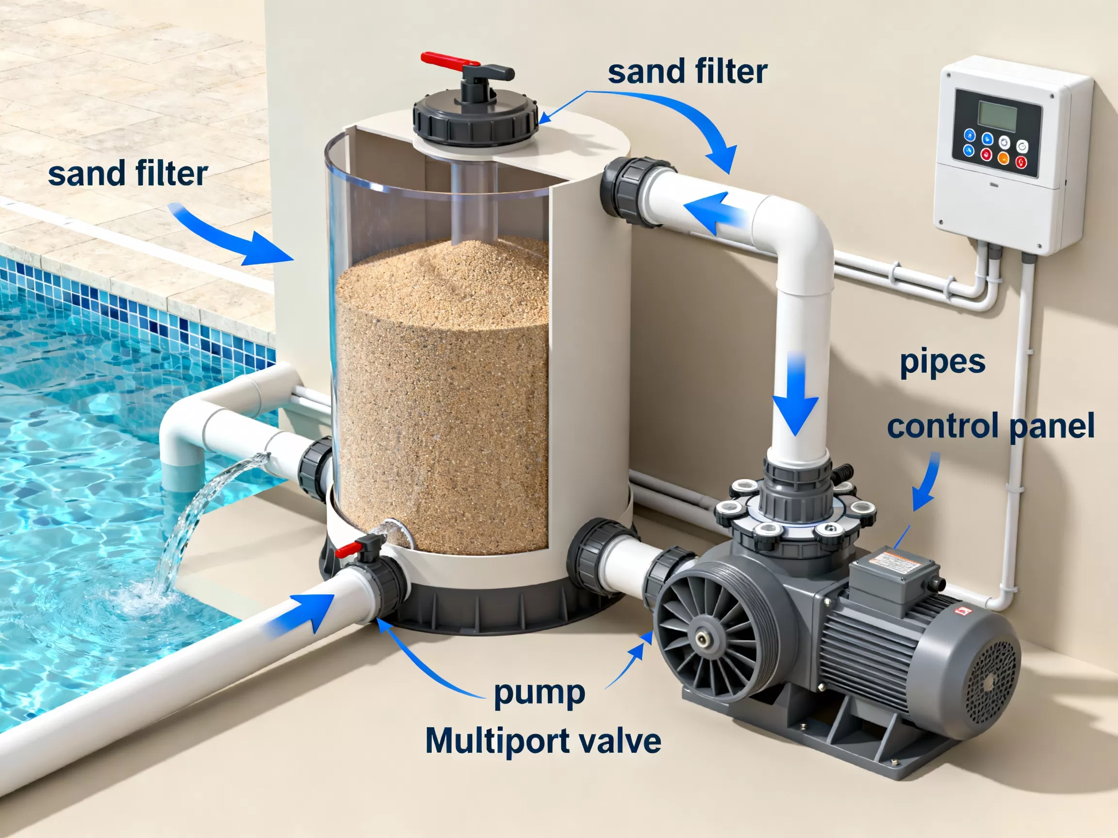 Система фильтрации — это основа основ в оборудовании для бассейна. Она отвечает за удаление механических загрязнений и обеспечивает циркуляцию воды. Без качественной фильтрации невозможно поддерживать воду чистой и прозрачной.