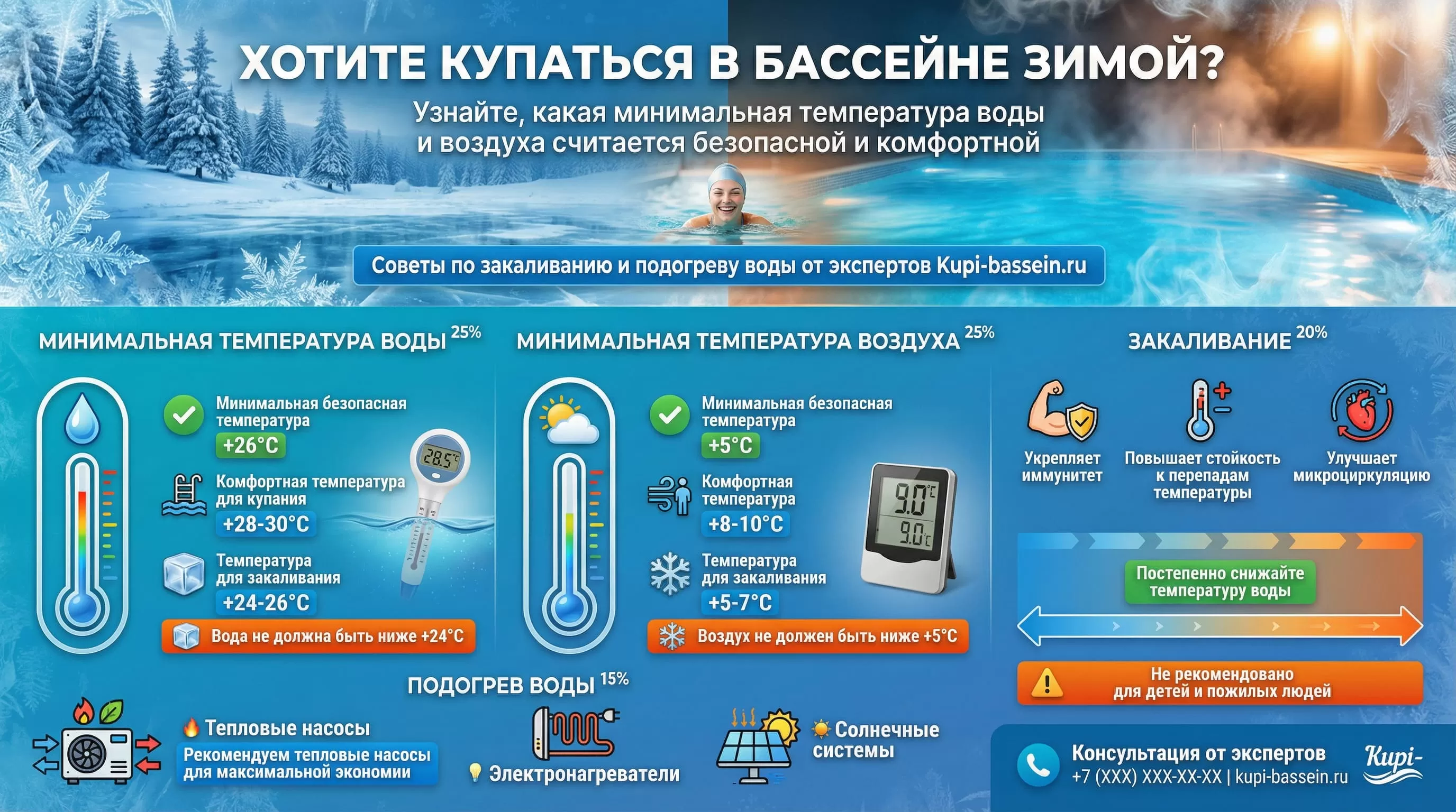 Главный вопрос, который волнует каждого, кто решается на зимнее плавание: «При какой температуре это вообще возможно и безопасно?». Компания Kupi-bassein.ru поможет вам разобраться в цифрах, рисках и удовольствиях.