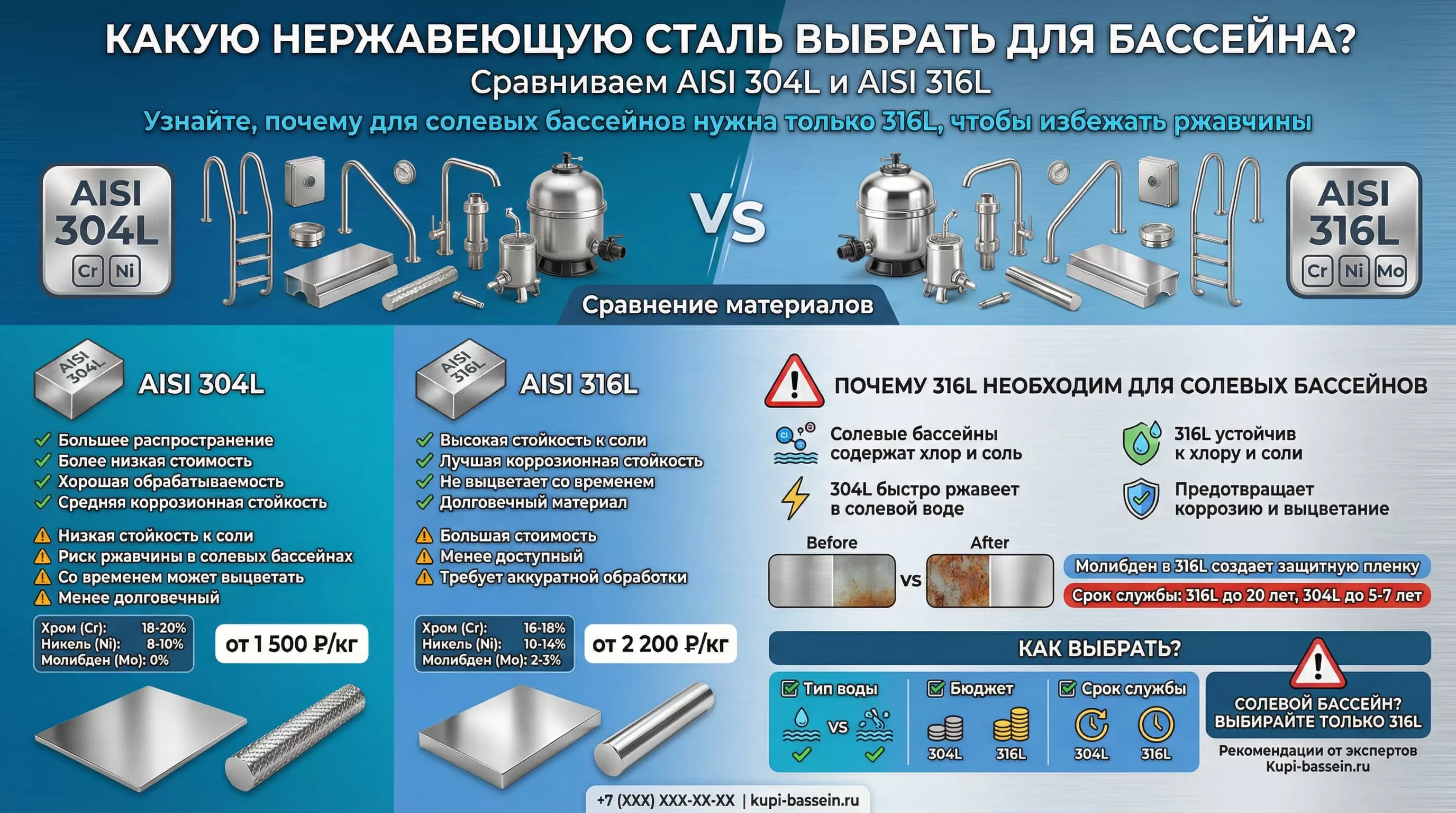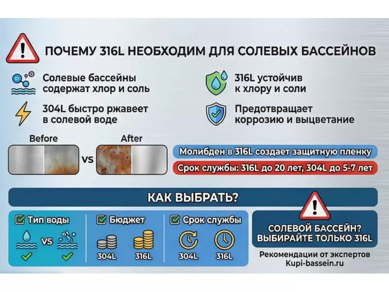Вывод по 316L: Это единственно верный выбор для бассейнов с морской/соленой водой. Это инвестиция в спокойствие на десятилетия.