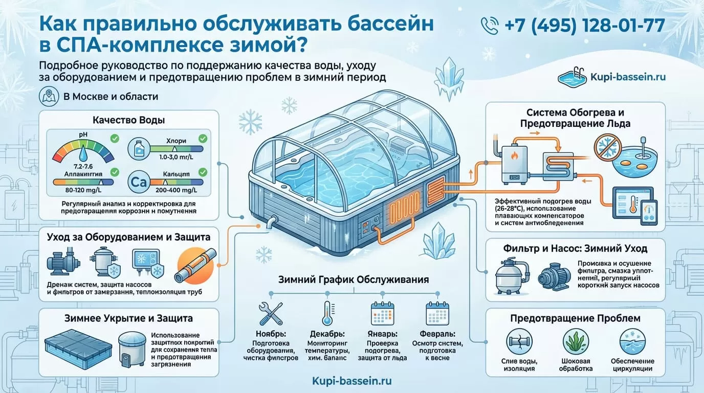 Зимний период для СПА-комплексов в Москве и Московской области — это время повышенной ответственности за состояние бассейнов. В отличие от частных чаш, которые часто консервируют, коммерческие и полу-коммерческие бассейны в SPA-центрах должны работать круглый год, обеспечивая клиентам комфорт и безопасность. Правильное обслуживание в этот критически важный сезон не только сохранит качество воды, но и продлит срок службы оборудования, а также существенно сэкономит бюджет на ремонт.