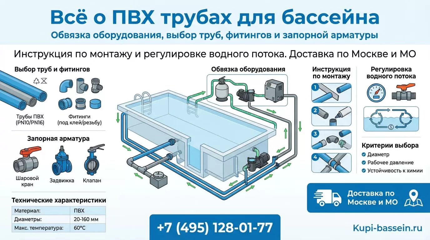 Система обвязки оборудования — это, по сути, кровеносная система любого искусственного водоема. От того, насколько качественно подобраны трубы ПВХ, фитинги, запорная арматура и дроссельные заслонки, зависит эффективность фильтрации, безопасность эксплуатации и долговечность самого бассейна. Ошибки на этапе прокладки трубопровода могут привести к дорогостоящему ремонту чаши и оборудования. В этой статье мы подробно разберем все элементы трубопроводной системы ПВХ для бассейна, учитывая специфику строительства и эксплуатации в Москве и Московской области.