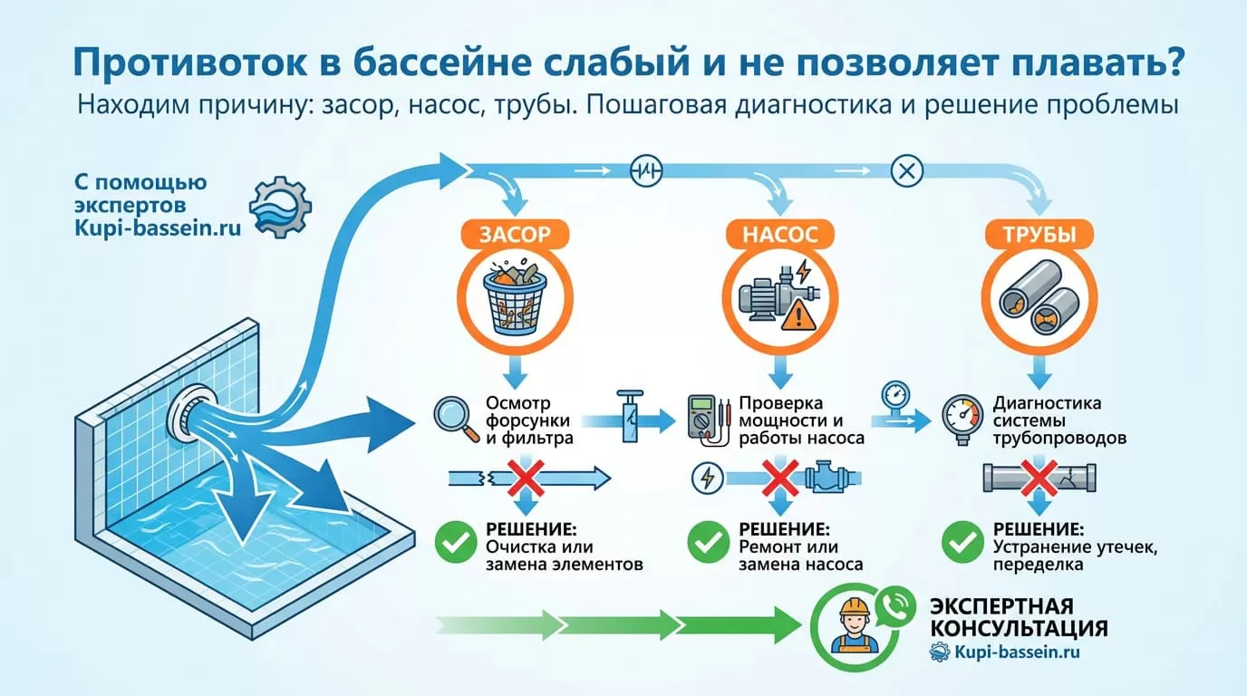 - Как исправить: Установить отдельный, специализированный насос для противотока. Это единственно верное решение.