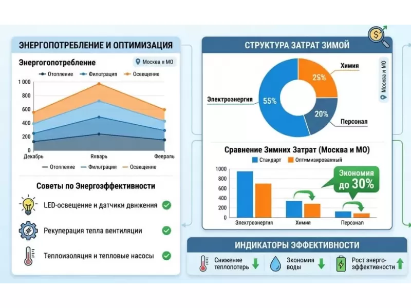 Зима — самый дорогой сезон в плане коммунальных платежей. Для поддержания комфортной температуры воды (+26°C... +29°C) теплообменники работают практически непрерывно. Если система интегрирована с газовым котлом, затраты будут ниже, если с электрическим — это станет основной статьей расходов. Также критически важно поддерживать температуру воздуха на 1–2 градуса выше температуры воды, чтобы минимизировать испарение.