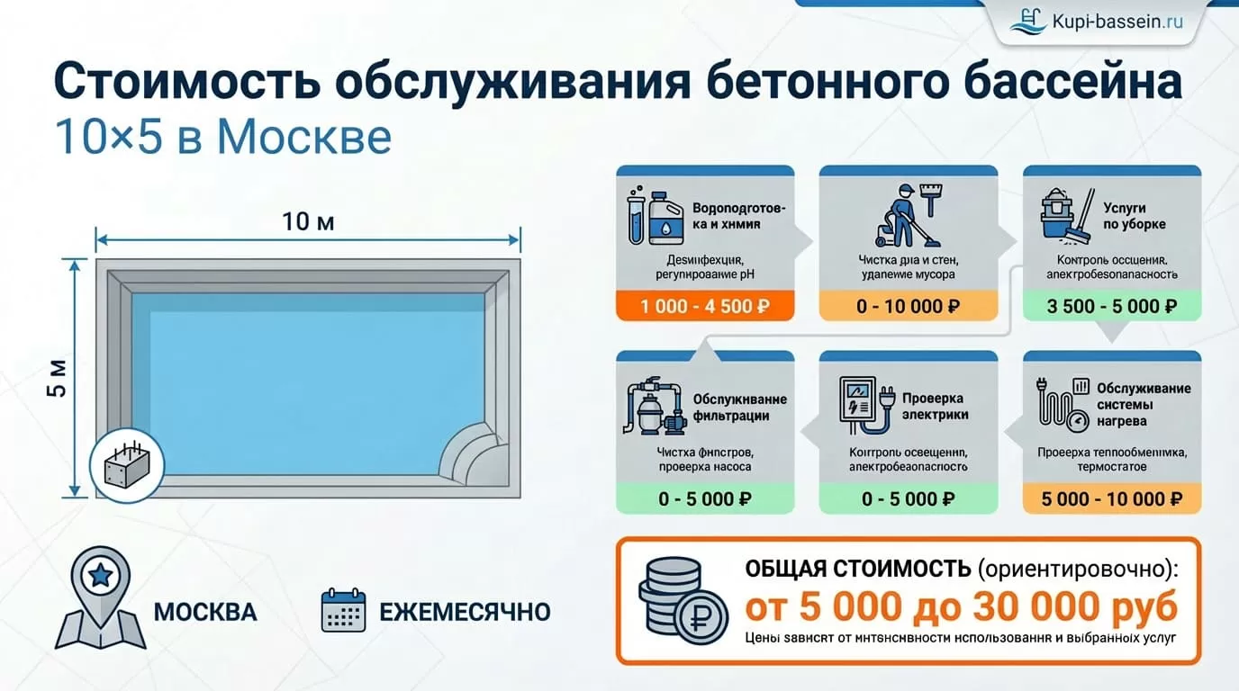 Владение большим бетонным бассейном, таким как 10х5 метров, — это удовольствие, требующее системного подхода и определенных затрат. Многие владельцы в Москве и Московской области интересуются, какая сумма нужна ежемесячно для поддержания чаши в идеальном состоянии. Kupi-bassein.ru подготовил для вас подробный расчет, основанный на реальных ценах и условиях.