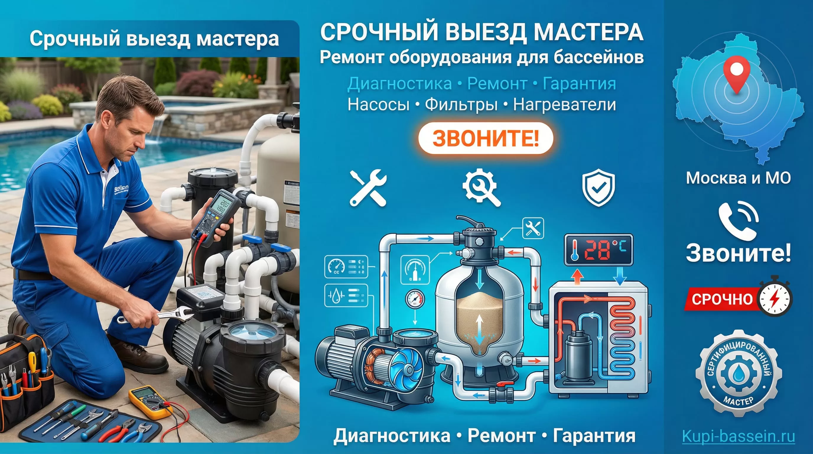 Ваш бассейн перестал радовать? Вода зеленеет, насос гудит, а нагреватель не греет? Не паникуйте и не пытайтесь решить проблему «наугад». Чем дольше вы ждете, тем сложнее и дороже может быть ремонт. Компания Kupi-bassein.ru предлагает услуги профессионального мастера по ремонту оборудования для бассейнов в Москве и Московской области. Мы приедем быстро, найдем причину и устраним ее с гарантией.