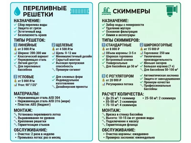 Существует несколько типов скиммеров. Врезные скиммеры монтируются в стену бассейна при строительстве и являются наиболее популярным вариантом для бетонных и полипропиленовых бассейнов. Навесные скиммеры устанавливаются на бортик каркасного бассейна и легко снимаются для очистки. Встроенные скиммеры интегрируются в конструкцию бассейна и отличаются максимальной герметичностью.