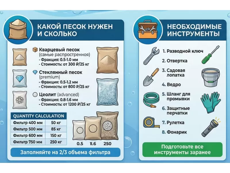 Важно: Никогда не используйте речной или строительный песок! Он содержит глину, ил и органику, которые превратят ваш фильтр в грязную жижу.