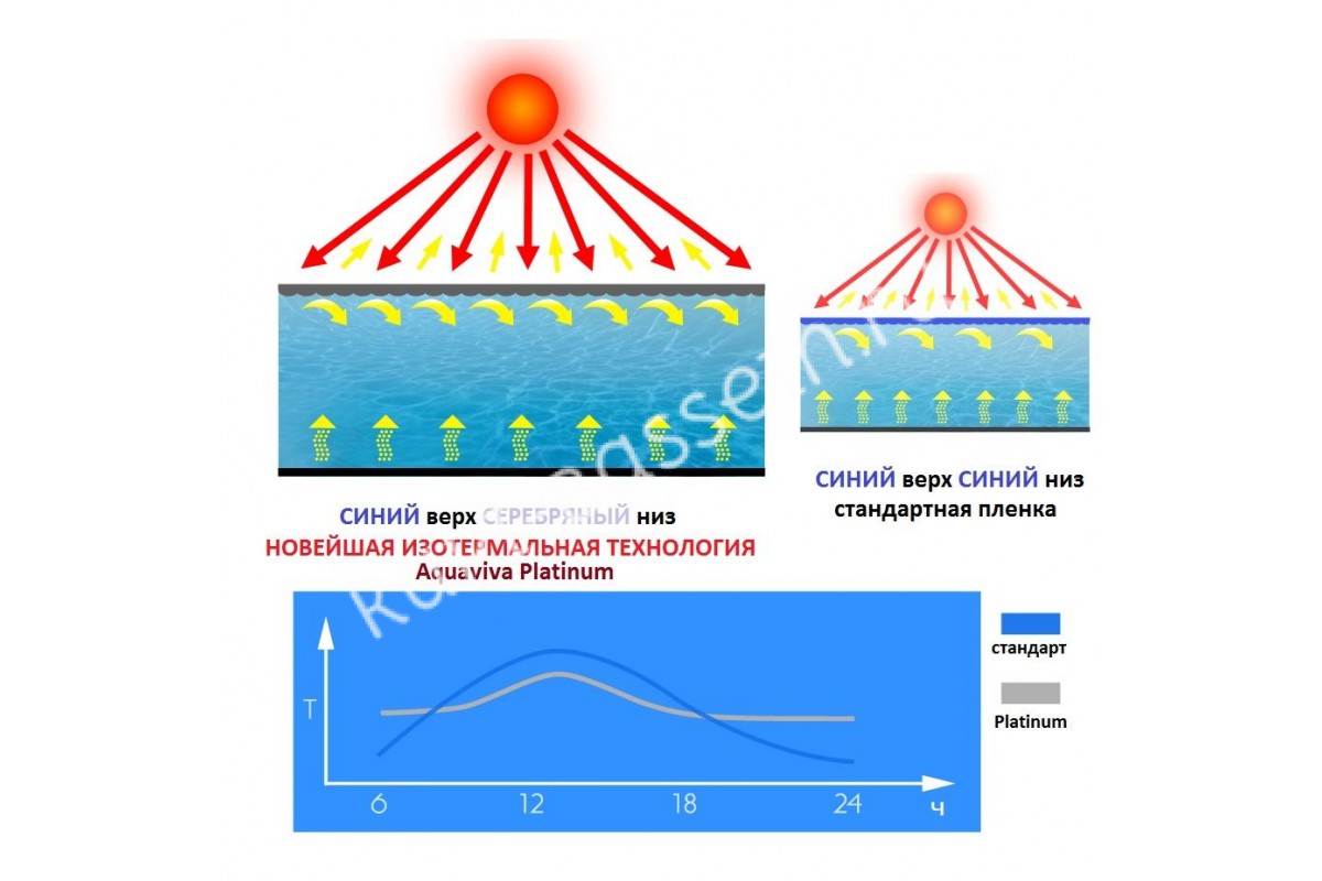 Лицевая голубая сторона впишется во внешний вид любого водоема и окружения. Через полупрозрачный синий слой проходит солнечное тепло и передается воде бассейна. Пленка Platinum способна обеспечить нагрев в среднем на 2-5 С даже без каких-либо нагревателей.