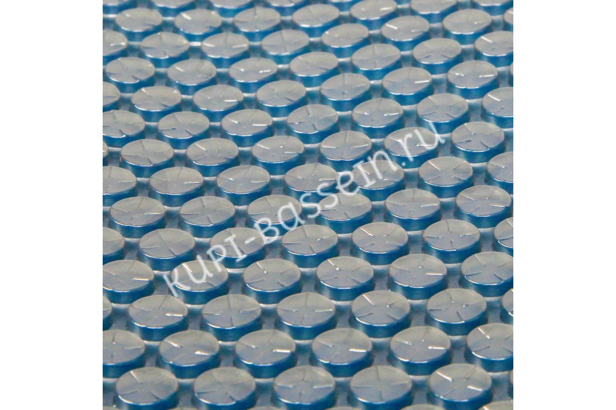 Серебряная сторона – тыловая часть пленки, которая содержит воздушные ячейки. Каждая камера цилиндрической формы наполнена воздухом и имеет размер 10х3.5 мм. Воздух выступает буфером между слоями и позволяет держать тепло в воде. Равномерное распределение воздушных ячеек по площади покрытия позволяет ему также держаться на плаву. Напыление серебряного цвета используется в качестве отражателя (принцип термоса), не давая теплу покидать воду.