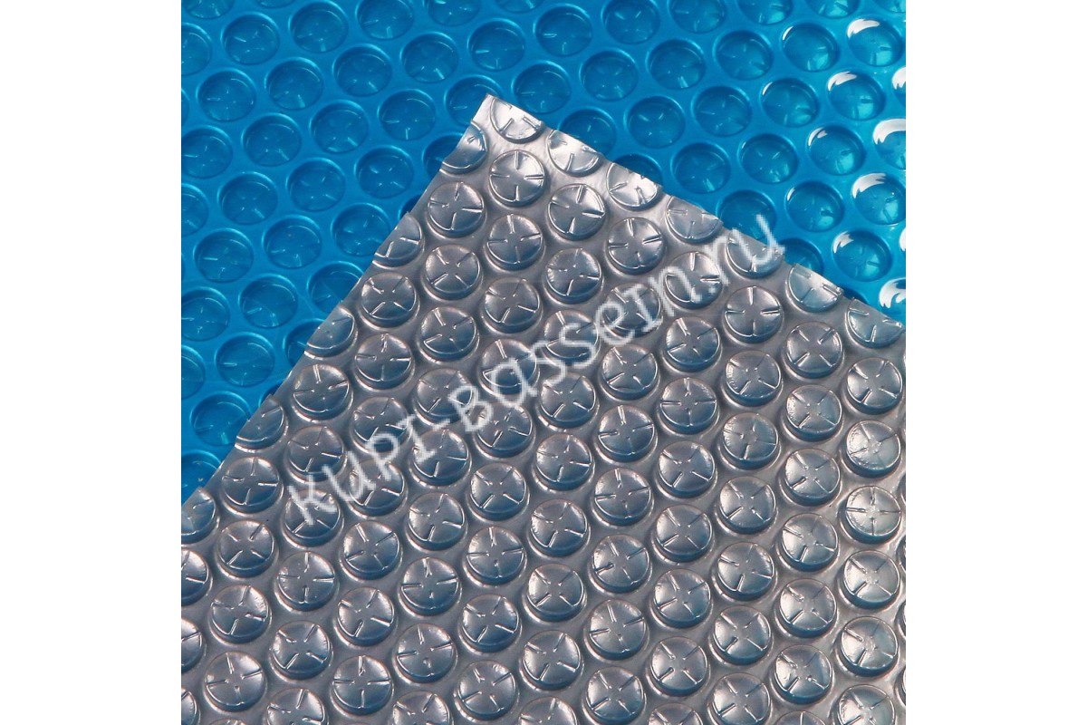Серебряная сторона – тыловая часть пленки, которая содержит воздушные ячейки. Каждая камера цилиндрической формы наполнена воздухом и имеет размер 10х3.5 мм. Воздух выступает буфером между слоями и позволяет держать тепло в воде. Равномерное распределение воздушных ячеек по площади покрытия позволяет ему также держаться на плаву. Напыление серебряного цвета используется в качестве отражателя (принцип термоса), не давая теплу покидать воду.