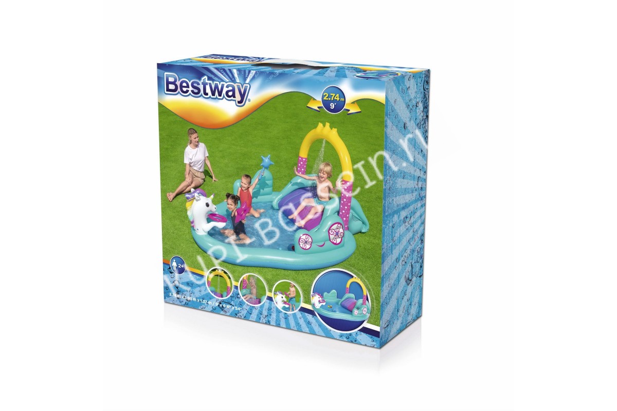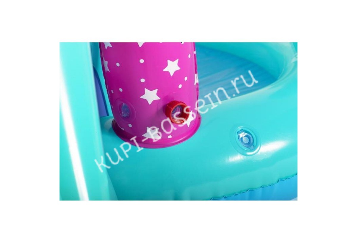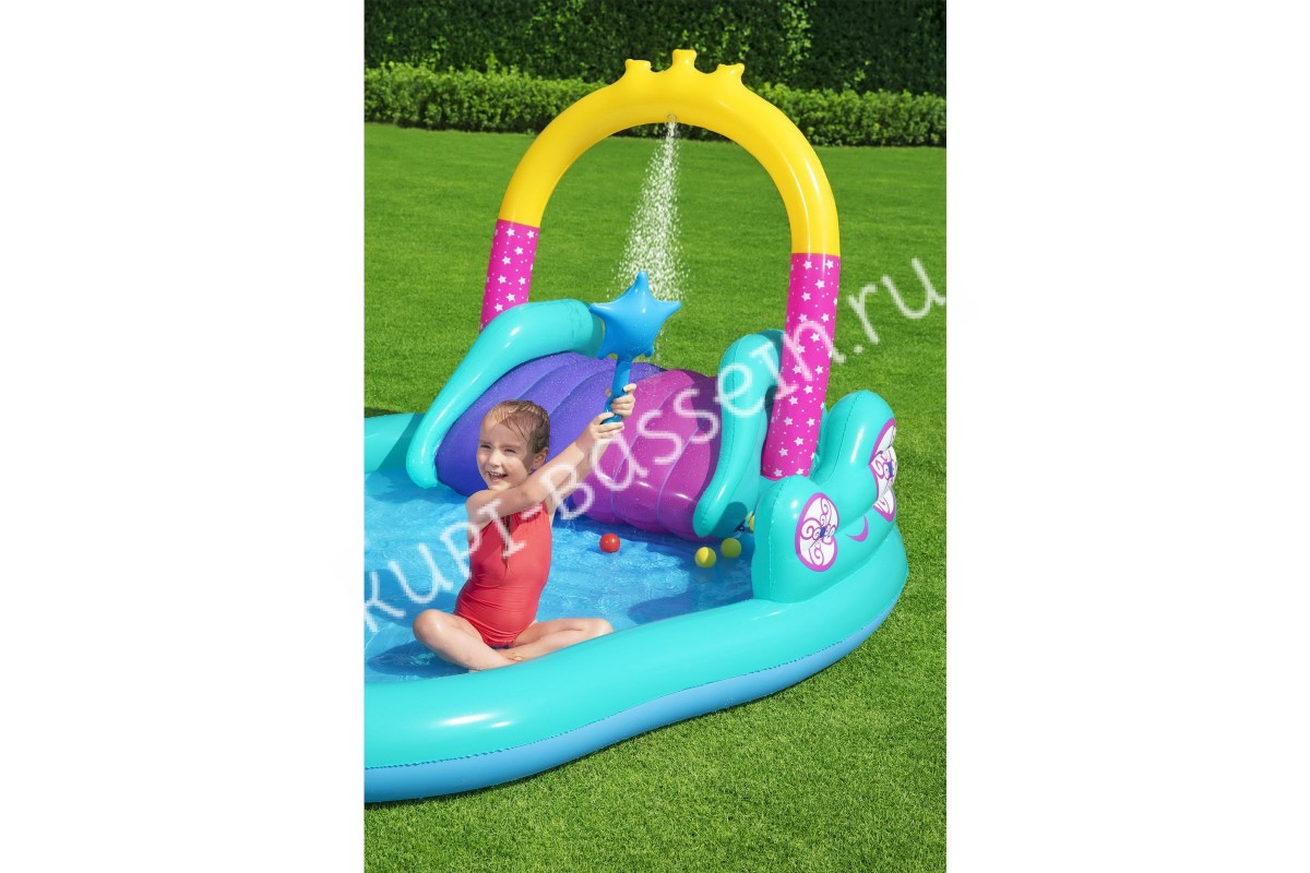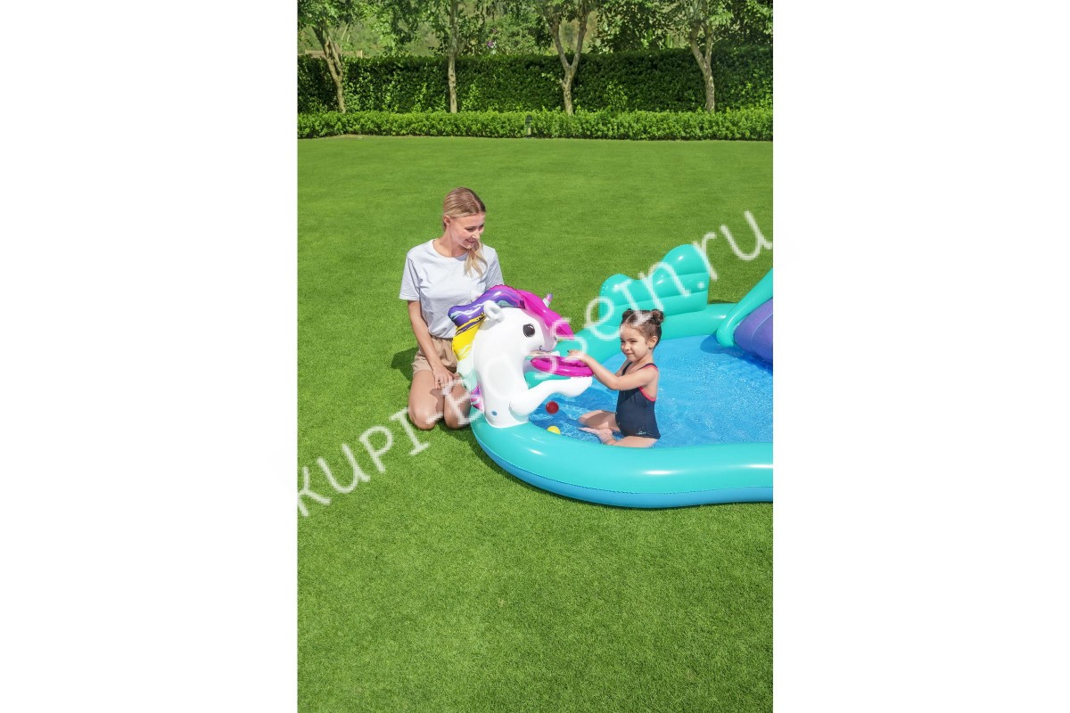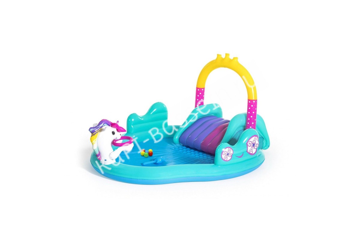 Игровой центр Bestway 53097 Волшебный единорог - станет отличным вариантом для летнего детского отдыха. Центр оснащен надувной горкой и разбрызгивателем, в виде извержения лавы вулкана. Для активных игр предусмотрены 4 игровых мячика (для спуска по надувной рампе) и одно надувное кольцо. Большие и широкие стенки из уплотненного винила, состоящие из надувных элементов, обеспечивают комфортное купание с максимальной степенью безопасности. Небольшие габариты позволяют разместить такой бассейн на небольшом участке двора или самого дома. Также бассейн отлично подходит для использования в качестве игрового манежа для малыша. Габаритов чаши будет достаточно для купания 3-4 малышей.