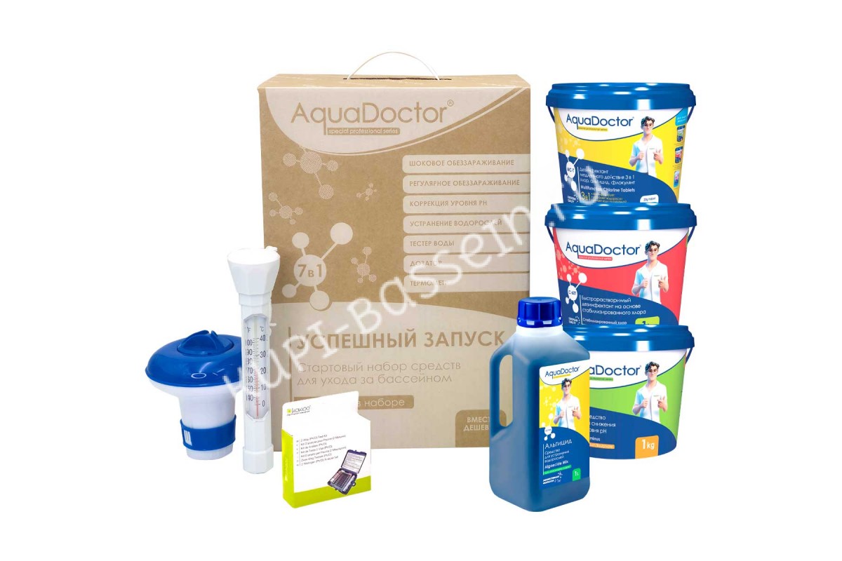 Препараты AquaDoctor C-60T и AquaDoctor MC-T предназначены для шоковой и регулярной дезинфекции воды в бассейне. Для удобства применения таблетированного хлора набор содержит дозатор.Стартовый набор для бассейна AquaDoctor 7 в 1 - идеальный вариант для первого запуска бассейна! Набор предназначен для первичной и регулярной обработки воды в бассейне до 30 м³. Все препараты и аксессуары подобраны для комплексного применения и гарантируют чистую и прозрачную воду в вашем бассейне.