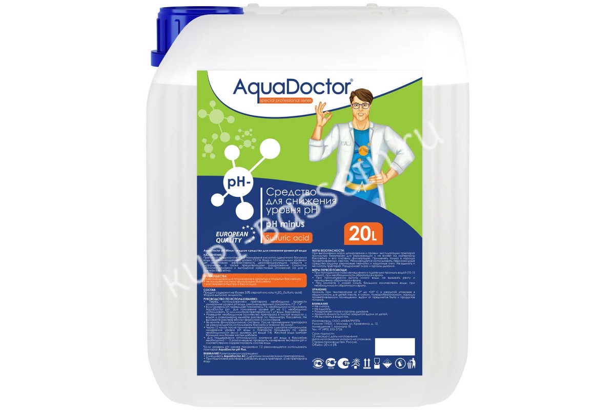 Препарат поставляется в жидком видеДля понижения уровня pH на 0.1 необходимо добавить препарат АкваДоктор рН- из расчета 10 мл средства на 1 м³ водыНеобходимо 1-2 раза в неделю проверять уровень pH , а также после выпадения осадков (для открытых бассейнов)Продукция сертифицирована