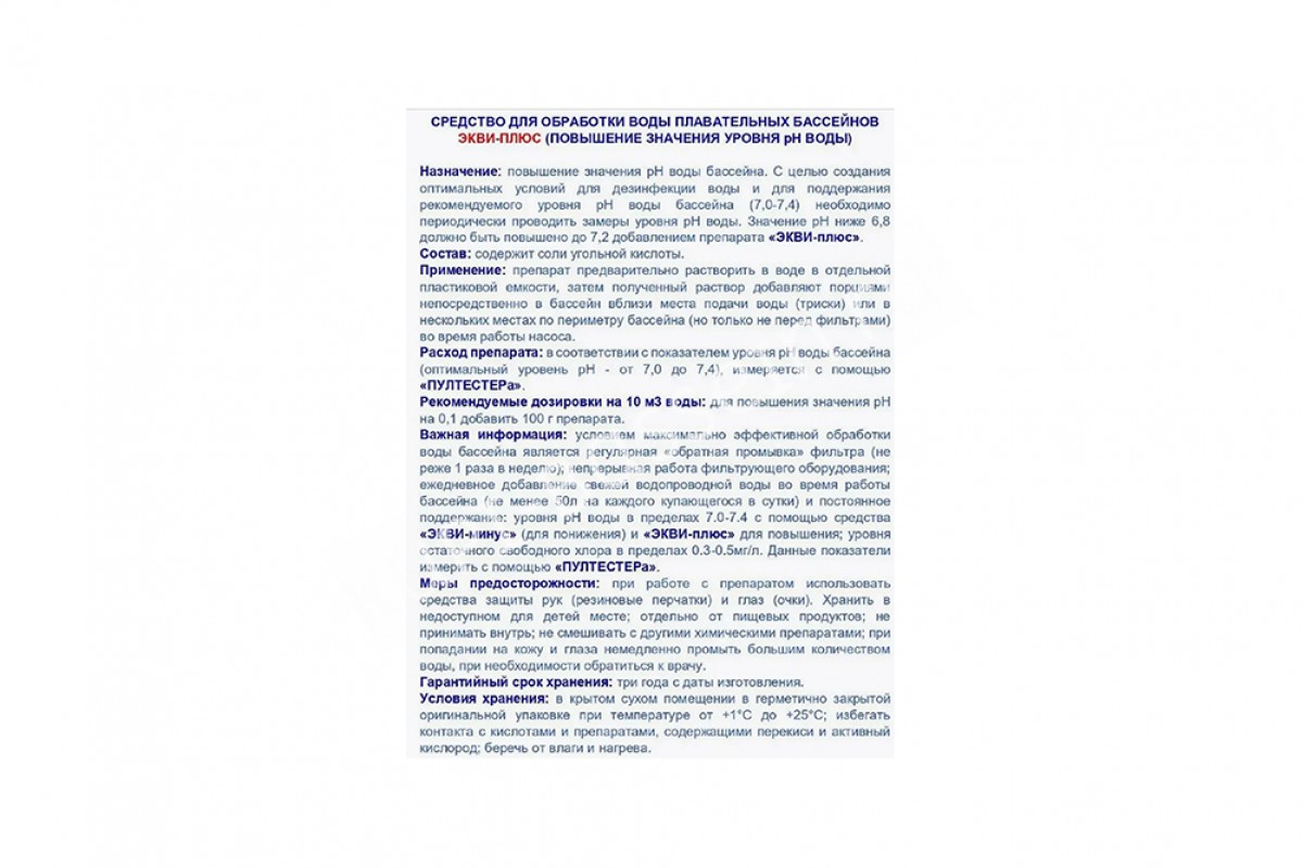Расход препарата – в соответствии с показателем уровня рН воды бассейна (оптимальный уровень рН – от 7,0 до 7,4), измеряется
