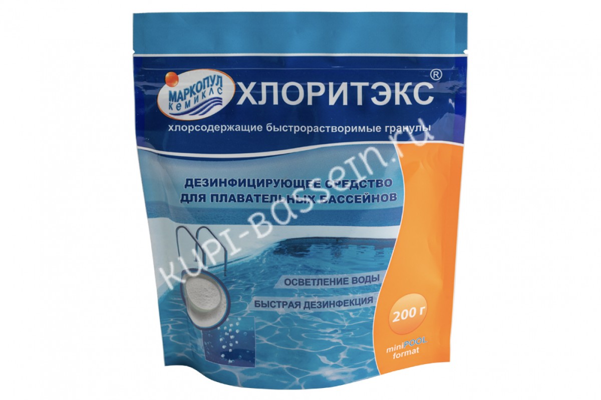 •заросший водорослями бассейн: сначала 200г «ХЛОРИТЭКСа», затем (через 10-12 часов) 250мл «АЛЬГИТИННа». Требуется