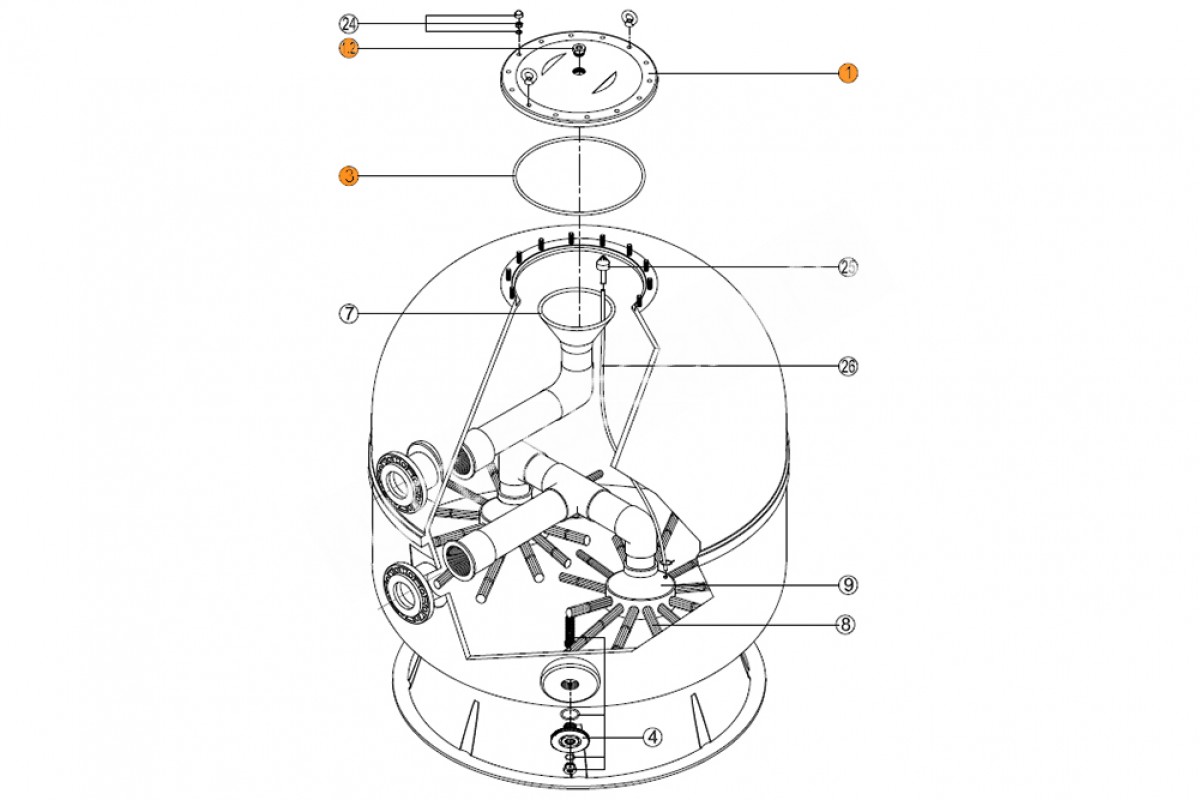 Поз. №1, 1.2, 3 - Крышка бочки фильтра Artik (д.1050мм-1800мм) с прокладкой Kripsol, Альтернативное название Крышка бочки фильтра AK Kripsol 1050-2000 RCFI0001.01R