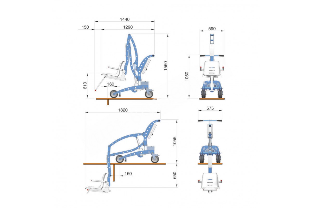 Грузоподъемность: 136 кгМаксимальный ход: 1260 ммВход в воду: 650 ммВремя спуска пловца в воду: 20 сек.Время подъема пловца: 25 секАвтономность: 60 рабочих цикловАккумулятор: 12 ВНапряжение: 24 ВМобильная кнопочная панельВлагозащита: IPX06Диаметр колес: 200 ммСтояночный тормоз на задних колесахПоворотные задние колесаДвухточечный ремень безопасностиОкрашенная конструкция из нержавеющей стали для деталей, контактирующих с водой