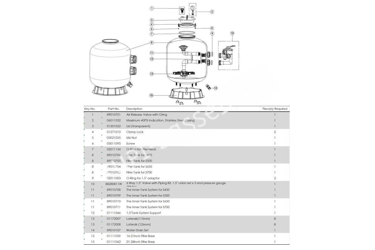Прозрачная крышка с обжимным хомутом на резьбовом крепленииВоздушный клапан устраняет воздушные пробки во время работыМногопозиционный кран, позволяет выбрать любой из режимов работы фильтраДренажная пробкаВерхний диффузор распределяет воду над песочной подушкойПесочный/водный дренаж высокого давления для быстрой консервации на зиму и быстрого обслуживания