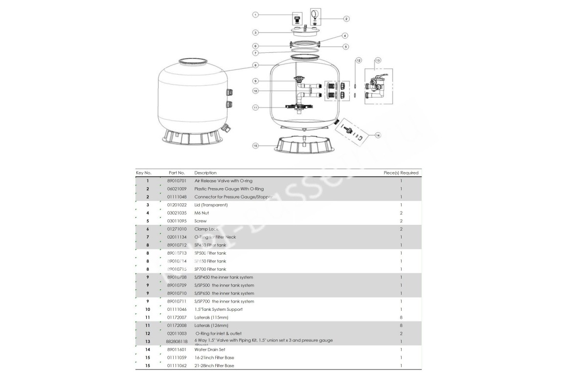 1. Воздушный клапан 2. Манометр для измерения давления внутри емкости 3. Прозрачная крышка 4. Зажимной хомут 5. Уплотнительное кольцо, для герметизации соединения 6. Диффузор фильтра 7. Корпус фильтрационной емкости 8. Сепаратор для забора очищенной воды 9. 6 - ти позиционный клапан с боковым типом подключения 10. Спусковая пробка 11. Основание фильтра