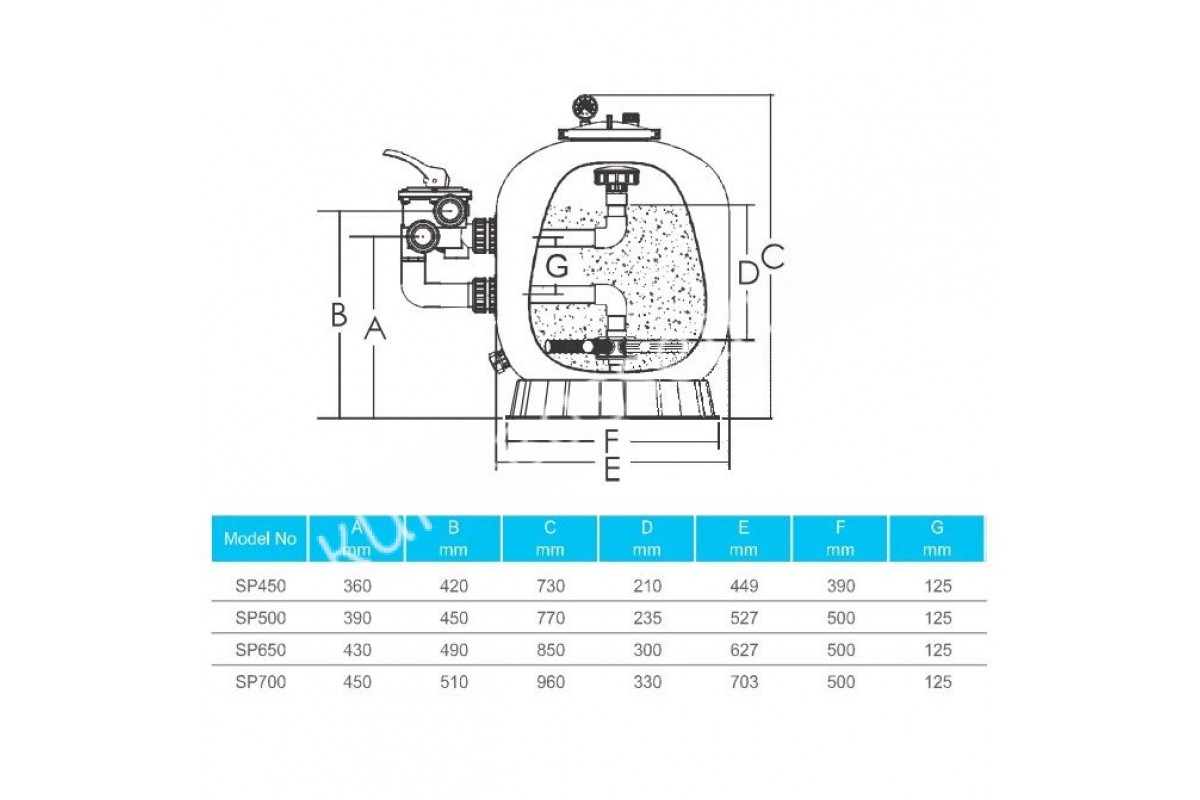 Диаметр фильтрующей емкости составляет 703 мм, с площадью фильтра – 0.39 м². Максимальное давление на фильтр составляет до 2 Бар. Температурный диапазон обрабатываемой жидкости от +1°С до +40 °С. Внизу емкости расположен дренажный клапан с пробкой, диаметром на 1,5 дюйма, для спуска воды и песка.