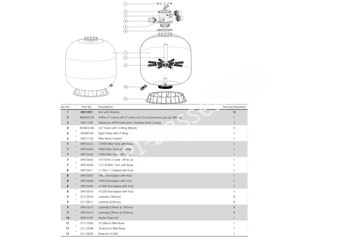 1. 6 - ти позиционный клапан с верхним типом подключения 2. Манометр для измерения давления внутри емкости 3. Соединительная муфта со смотровым окном 4. Цельный 360-градусный зажимной хомут 5. Уплотнительное кольцо, для герметизации соединения 6. Корпус фильтрационной емкости 7. Коллектор фильтра 8. Сепаратор для забора очищенной воды 9. Спусковая пробка 10. Основание фильтра