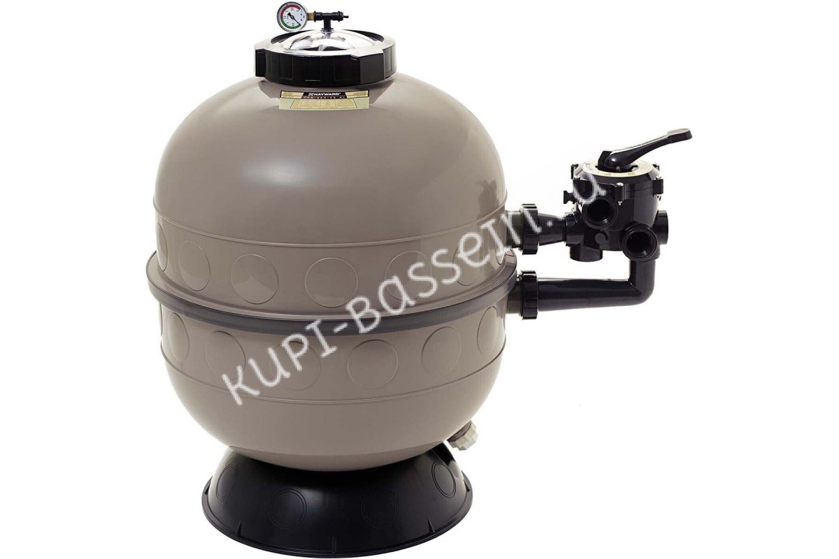 Фильтр оборудован шестиходовым клапаном с боковым типом подключения. Клапан оснащен индикатором мутности воды и манометром для контроля давления. В качестве фильтрующего элемента используется кварцевый или стеклянный песок фракцией от 0.4 до 0.8 мм.