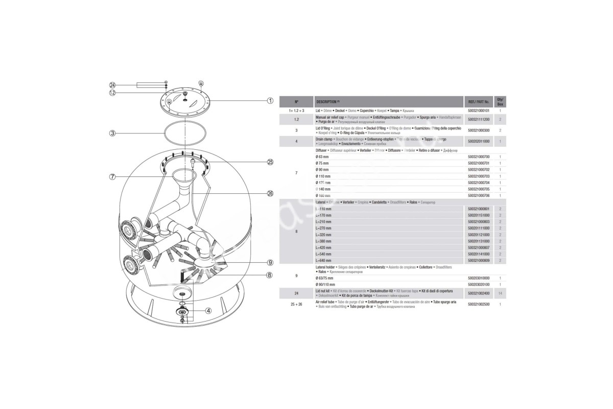 Hayward HCFA791402LVA ARTIC – мощный и высокоэффективный фильтр линейки HCF ARTIK SERIES. Модель разработана для обслуживания аквапарков и коммерческих бассейнов, объемом до 500 000 литров. Корпус фильтра выполнен из армированного стекловолокном полиэстера и усилен ламинированием. Ламинированная поверхность обеспечивает высокую устойчивость емкости к химически агрессивным веществам, ультрафиолету и коррозии. Фильтр HCFA791402LVA имеет боковое подключение с диаметром соединения – 140 мм, а также оборудован отверстиями для слива воды, спуска песка и воздуха. Бак фильтра вмещает до 5250 кг фильтрующей песочной массы. Для повышения качества фильтрации, рекомендуется использовать 1000 кг песка с фракцией 1-2 мм и 4250 кг песка с фракцией от 0.4 до 0.8 мм. Толщина фильтрующего слоя составляет 1 метр. Рабочее давление фильтра составляет от 0,5 до 2 бар. Рабочая температура воды – от +1 до +40ºС.