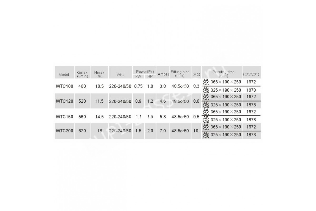 | WTC 150 | 560 | 14.5 | 220-240/50 | 1.1 | 1.5 | 5.8 | 50 | 9.5 |