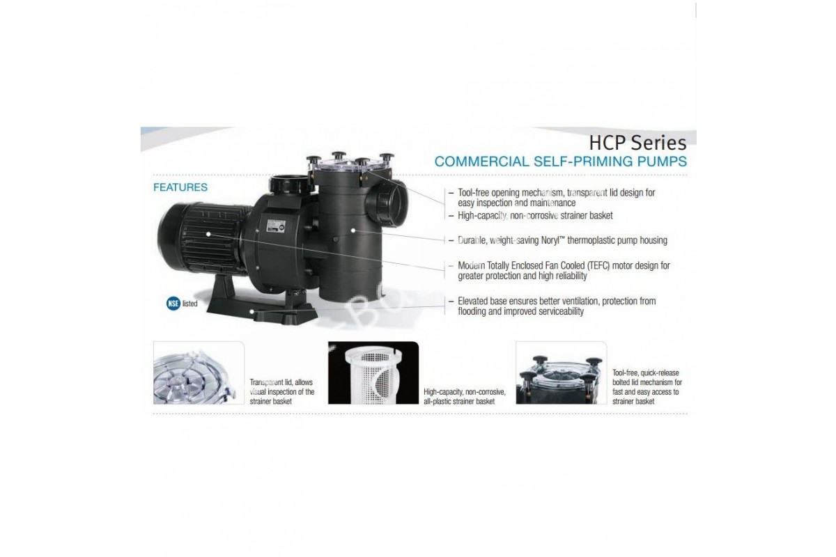 Hayward HCP38251E – современный насос центробежного типа, разработанный для обслуживания коммерческих бассейнов и СПА, является прекрасной альтернативой бронзовым и чугунным моделям. Он характеризуется высокой производительностью, надежностью, простотой монтажа и обслуживания.