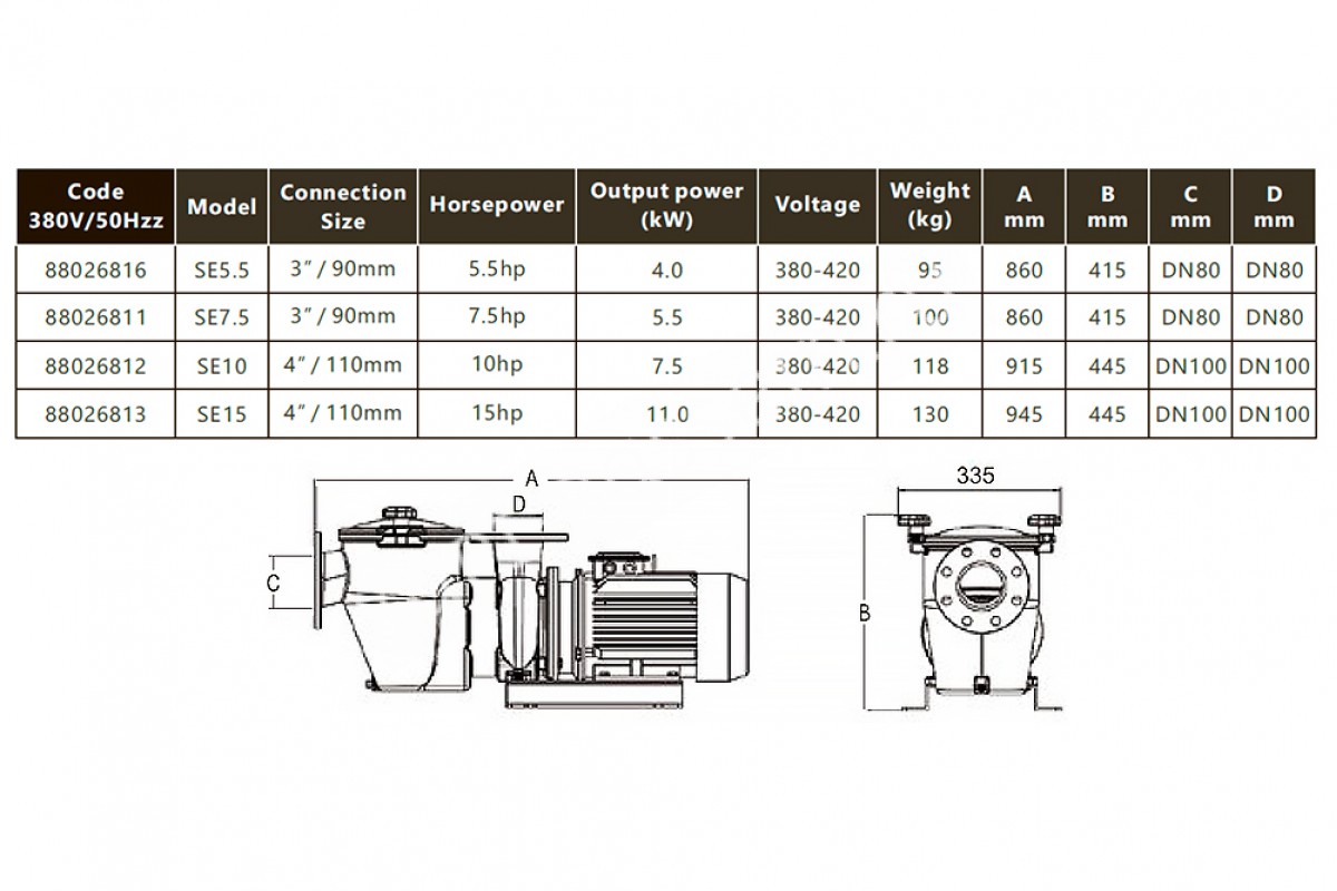 Насос (11 кВт 380В) Emaux SE15 88026813А является одноступенчатым насосом с горизонтальным расположением вала и рабочим колесом (крыльчаткой) одностороннего входа. Привод насоса электрический. Насос оснащен фильтром грубой очистки. Насос серии SE создан для коммерческого использования.