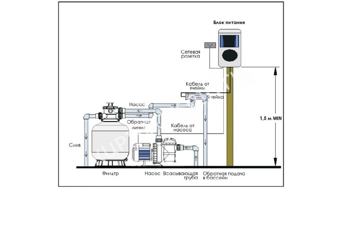 Установка хлоратора осуществляется согласно прилагаемой инструкции. Колба, где установлены электролизные ячейки, соединяется с трубой муфтами на 50 миллиметров. Монтаж ячейки выполняется после фильтрующего оборудования перед выводом воды обратно в чашу. Контрольный блок размещается вертикально через навесное крепление на стенку или столб на высоте не менее 1500 мм от пола. Для работы хлоратора требуется подключение в сеть 220В/50Гц.