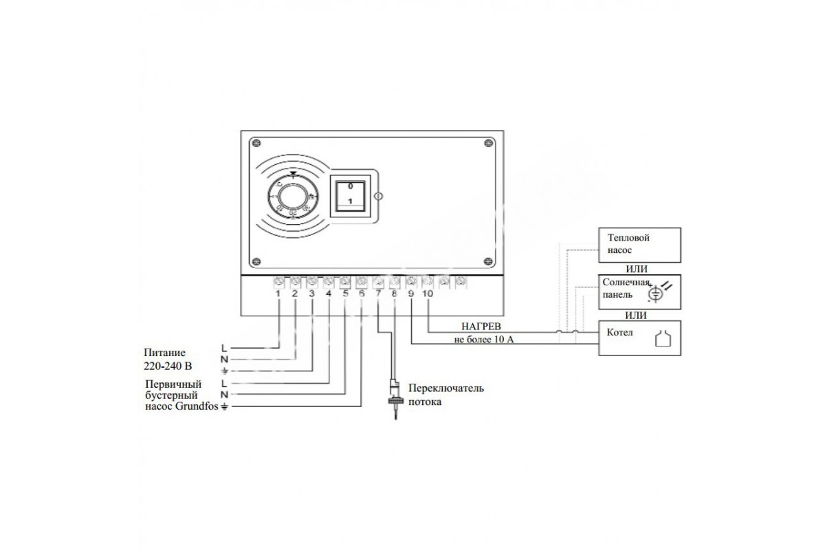 Управление: аналоговоеВыбор температуры термостата: 0-45°СТочность: 1.2°СДатчик протокаПереключатель потокаМинимальный уровень протока: 4000 л/часПитание: 220-240ВУровень защиты: IP44