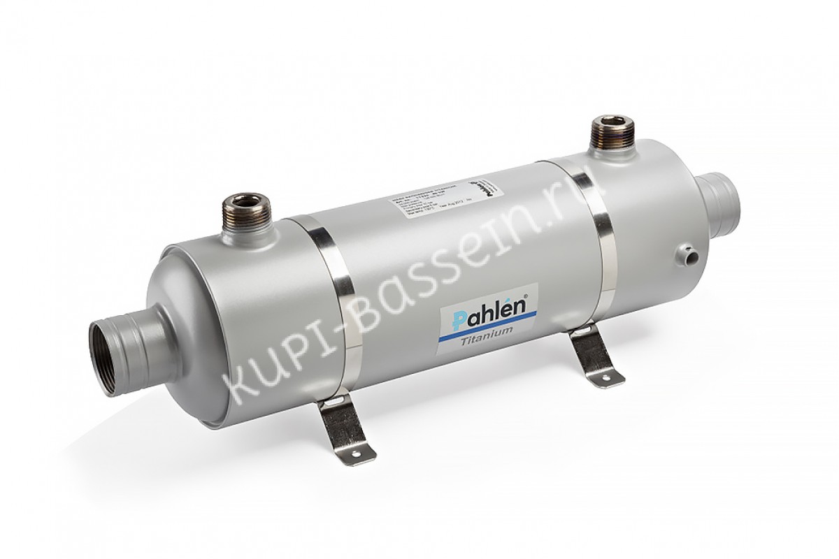 Предназначен для нагрева воды и поддержания заданной температуры в бассейне агрессивной средой (морская вода). Изготовлен из титана, что позволяет применять устройство в бассейнах с соленой водой или солевым электролизом. Кронштейны изготовлены из кислотостойкой нержавеющей стали марки AISI-316L. Подходит для любого типа инсталляций (котлы, тепловые насосы, солнечные панели и др.). Теплообменник оборудован спиралью для нагрева воды, что позволяет его использовать в системах с высоким давлением. Теплообменник титановый Pahlen представляет собой монолитный сварной кожух, в котором установлен нагреватель-змеевик через который с помощью насоса вода из бассейна попадает в теплообменник. При контакте воды со змеевиком происходит передача тепловой энергии и вода в бассейне нагревается. Если температура воды становится выше установленного значения на термостате, срабатывает автоматическая блокировка подачи воды в теплообменник.