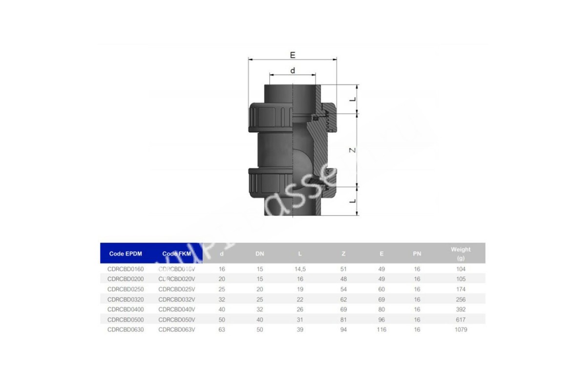 Обратный клапан ПВХ Effast CDRCBD0250 шаровый, с уплотнением EPDM, d25