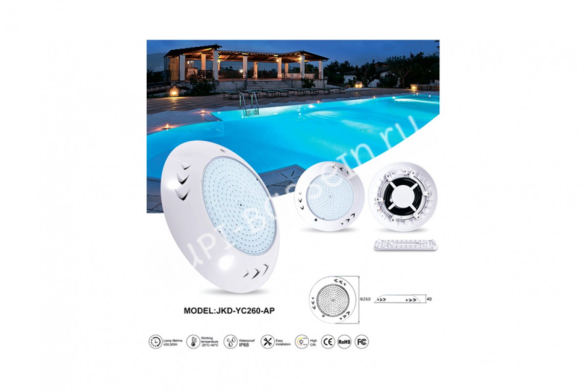 Прожектор накладной (35Вт/12В) LED RGB с пультом Tadpole JKD-YC260-AP - накладной прожектор для бассейнов и SPA от компании Tadpole — это качественное и надёжное решение для освещения. Корпус выполнен из ABS пластика и обеспечивает яркое освещение, создавая уютную атмосферу.
