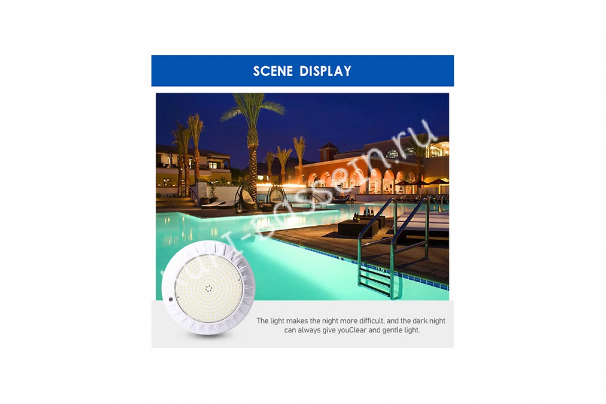 Обслуживание прожектора сводится к минимуму и не требует специальных навыков. Устройство соответствует стандарту водонепроницаемости IP68. Прожектор предназначен для использования его в бассейнах, отделанных плиткой.