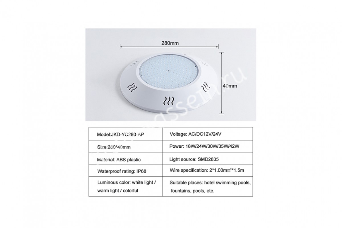 Прожектор накладной (35Вт/12В) LED Warm white Tadpole JKD-YC280-AP - накладной прожектор для бассейнов и SPA от компании Tadpole — это качественное и надёжное решение для освещения. Корпус выполнен из ABS пластика и обеспечивает яркое освещение, создавая уютную атмосферу.