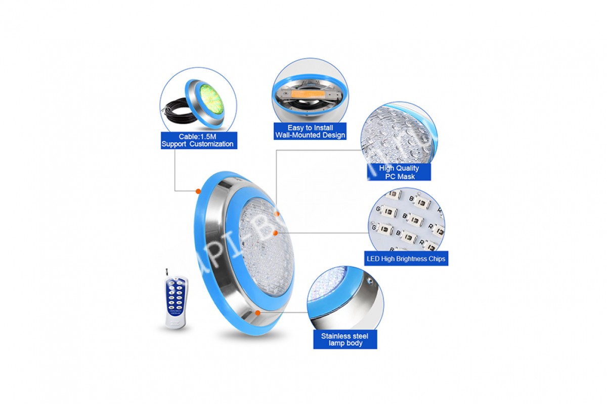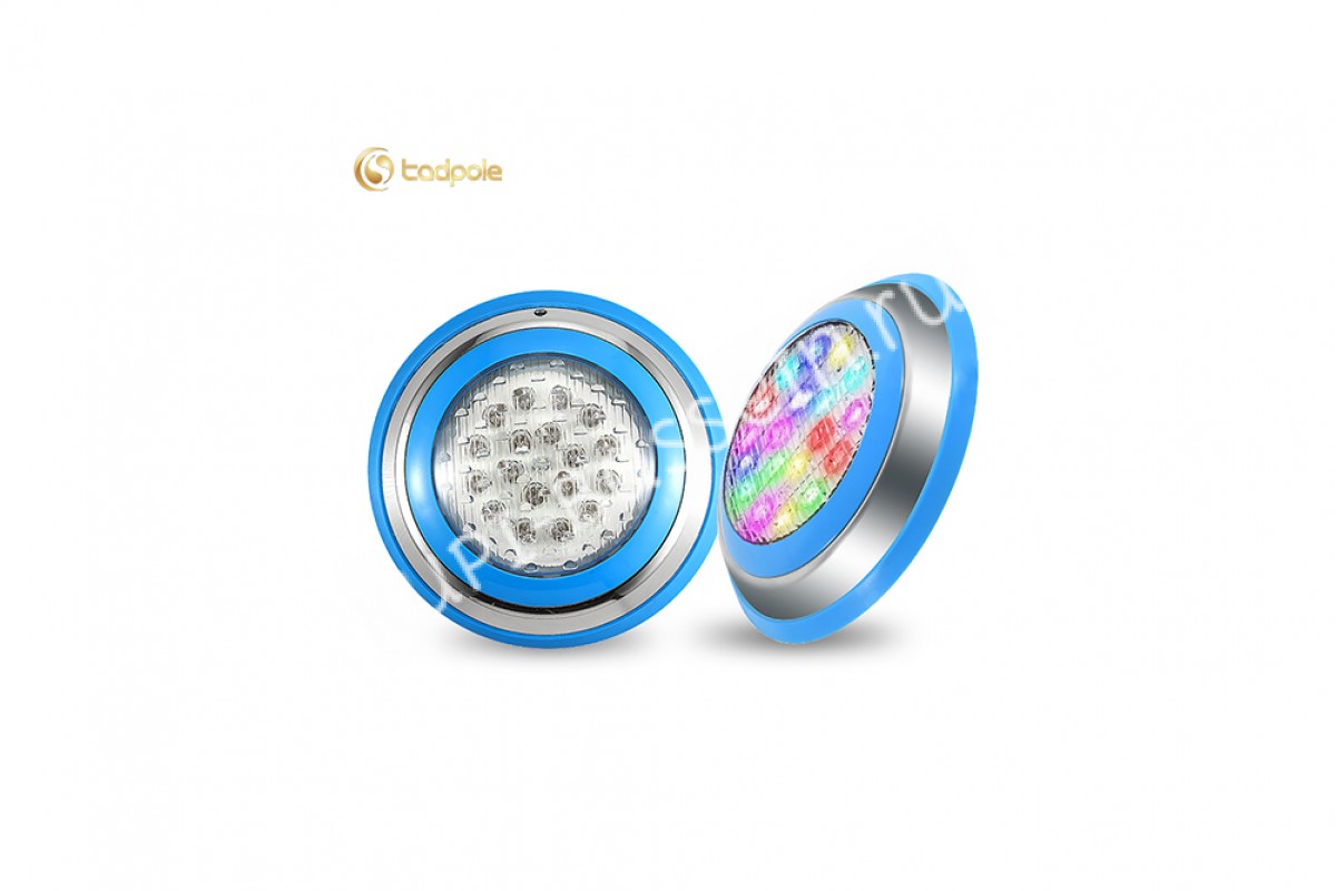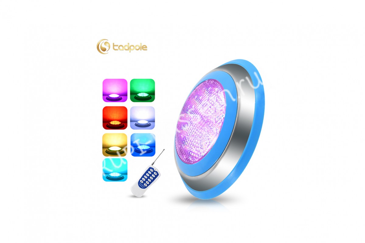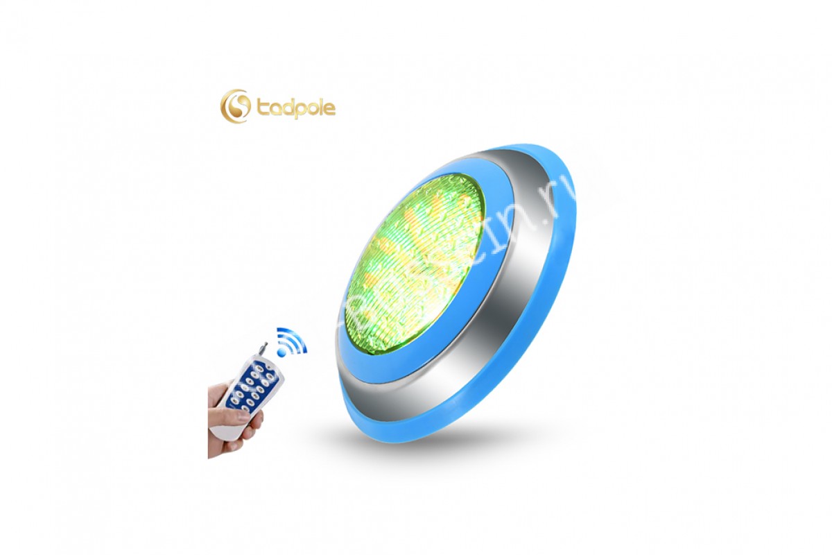 Прожектор накладной из нерж. стали рамка синяя (18Вт/12В) LED RGB с пультом Tadpole JKD-YC230-SP - накладной прожектор для бассейнов и SPA от компании Tadpole — это качественное и надёжное решение для освещения. Корпус выполнен из нержавеющей стали AISI 304 и обеспечивает яркое освещение, создавая уютную атмосферу.