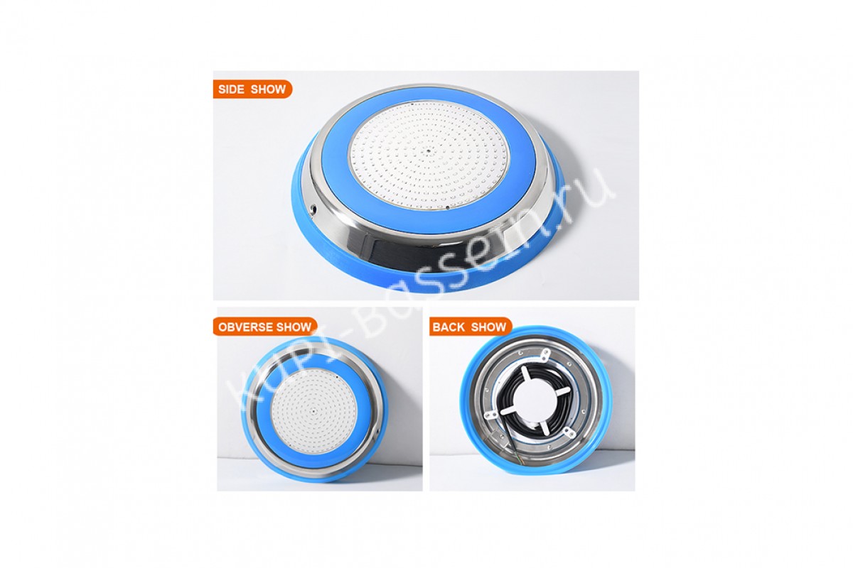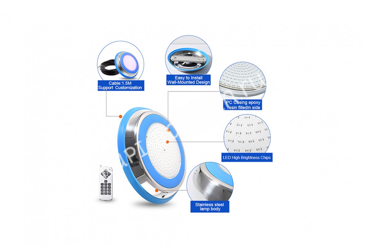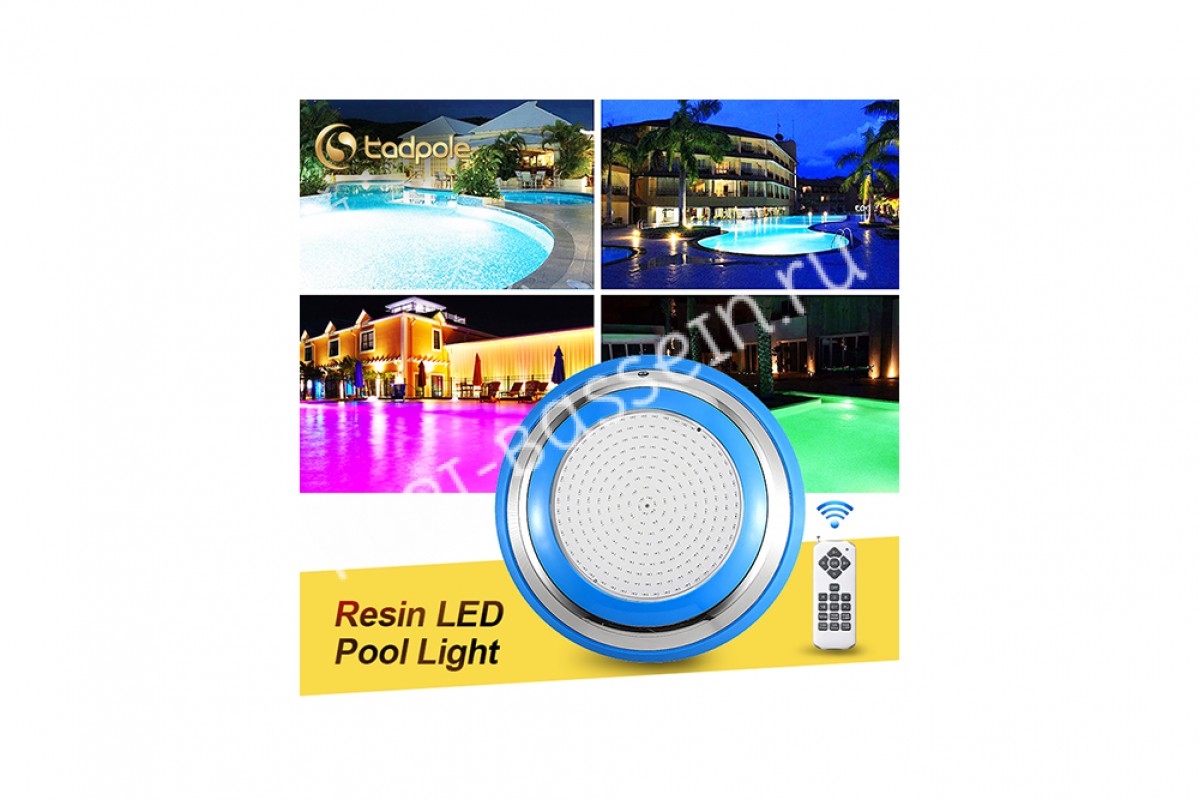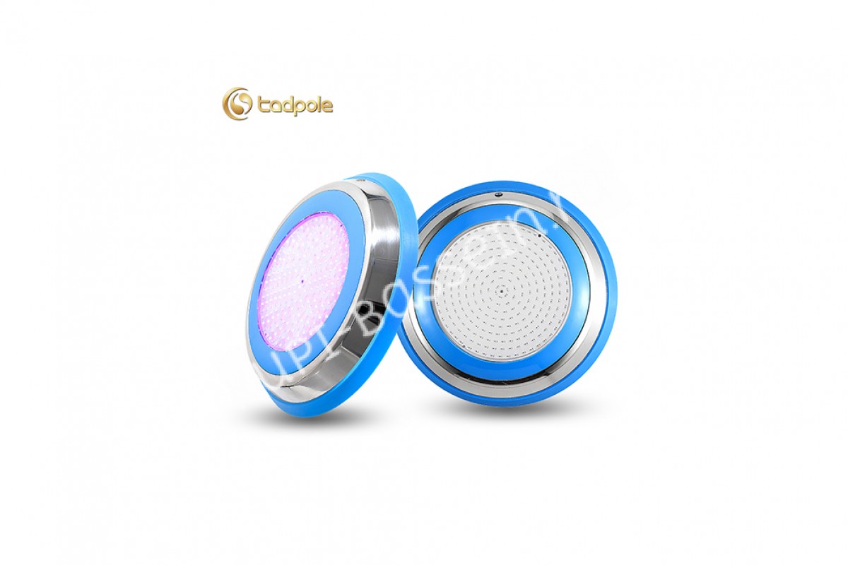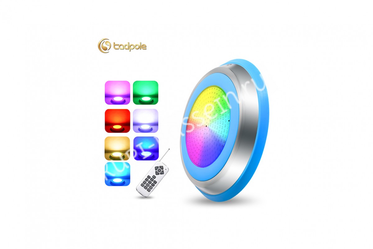 Прожектор накладной из нерж. стали рамка синяя (25Вт/12В) LED RGB с пультом Tadpole JKD-YC300-SP - накладной прожектор для бассейнов и SPA от компании Tadpole — это качественное и надёжное решение для освещения. Корпус выполнен из нержавеющей стали AISI 304 и обеспечивает яркое освещение, создавая уютную атмосферу.