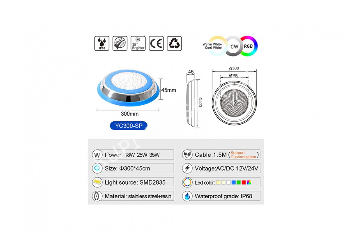 Прожектор накладной из нерж. стали рамка синяя (35Вт/12В) LED RGB с пультом Tadpole JKD-YC300-SP - накладной прожектор для бассейнов и SPA от компании Tadpole — это качественное и надёжное решение для освещения. Корпус выполнен из нержавеющей стали AISI 304 и обеспечивает яркое освещение, создавая уютную атмосферу.
