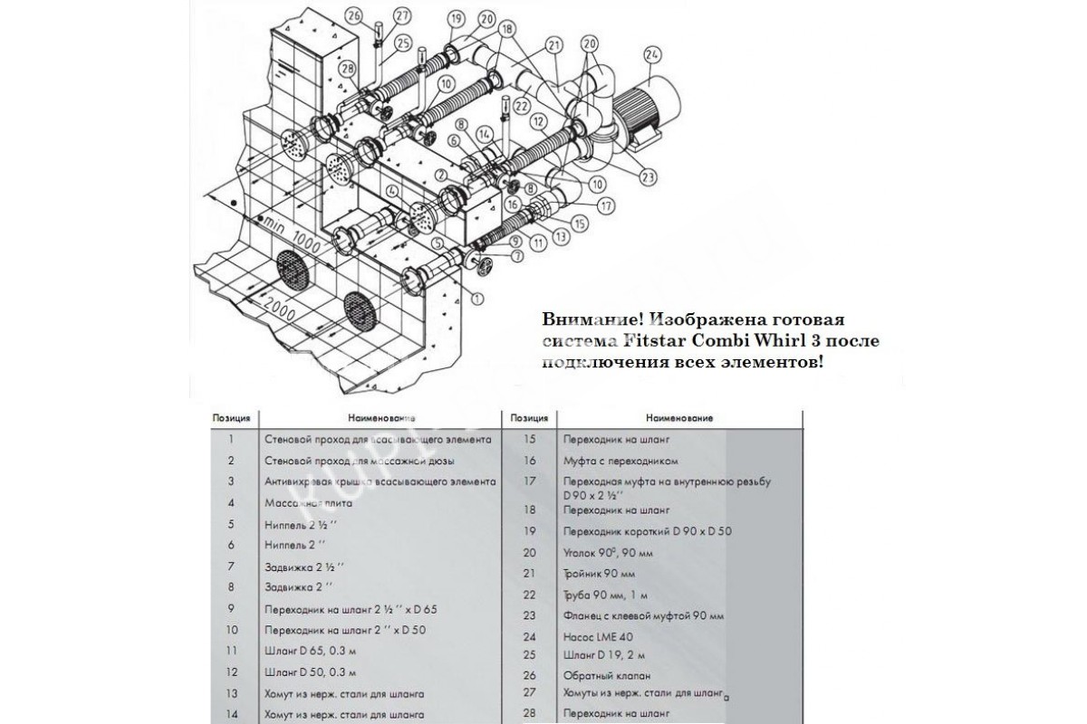 Насос FitStar (7731050), 4 кВт/380В: 1штМассажные дюзы FitStar (8673820): 3шт Накладка водозабора FitStar (8671520): 2штТрубопроводная арматура (тройники, краны, углы)