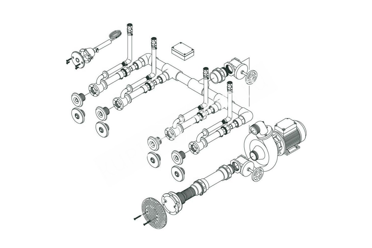 Комплект включает: насос, 4 форсунки, пьезокнопку, пневмоблок, лицевую панель водозабора, соединительные элементы, шланг