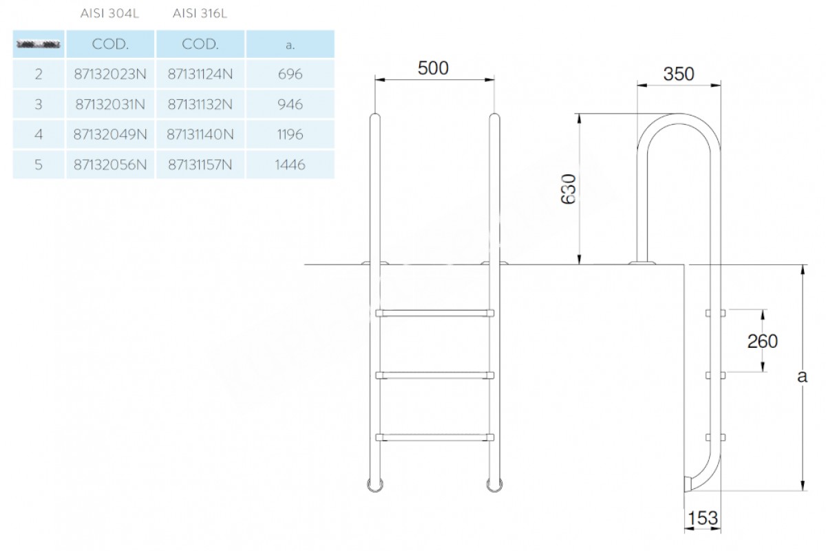 ИспанияПредназначена для удобного спуска и подъема из воды бассейна для монтажа на узкий борт. Она изготовлена из нержавеющей стали AISI 316, благодаря чему может быть установлена в бассейнах с морской водой. Крепится лестница к полу с помощью закладных стаканов (поставляются в комплекте). Для крепления в отделанную поверхность дополнительно приобретаются Адаптеры для лестницы. Внизу лестница упирается в стену бассейна через резиновые заглушки. Ступени лестницы комплектуются пластиковыми антискользящими накладками.