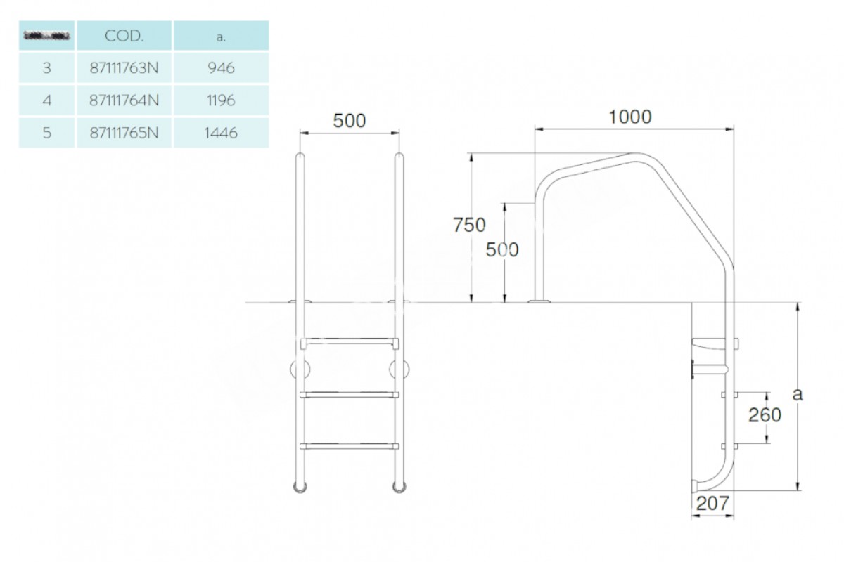 ИспанияПредназначена для удобного спуска и подъема из воды бассейна для монтажа на широкий борт. Она изготовлена из нержавеющей стали AISI-316, благодаря чему может быть установлена в бассейнах с морской водой. Крепится лестница к полу с помощью закладных стаканов (поставляются в комплекте) и дополнительно в стену фланцевым креплением. Для крепления в отделанную поверхность на борт бассейна дополнительно приобретаются Адаптеры для лестницы. Внизу лестница упирается в стену бассейна через резиновые заглушки. Ступени лестницы комплектуются пластиковыми антискользящими накладками.