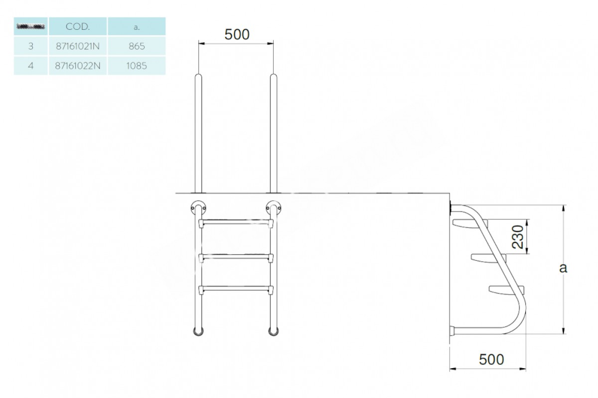 ИспанияСостоит из трех двойных ступенек с противоскользящими пластиковыми накладками. Она изготовлена из нержавеющей стали AISI-316, благодаря чему может быть установлена в бассейнах с морской водой. Крепление в стену фланцевое, снизу лестница упирается в стену бассейна через резиновые заглушки.