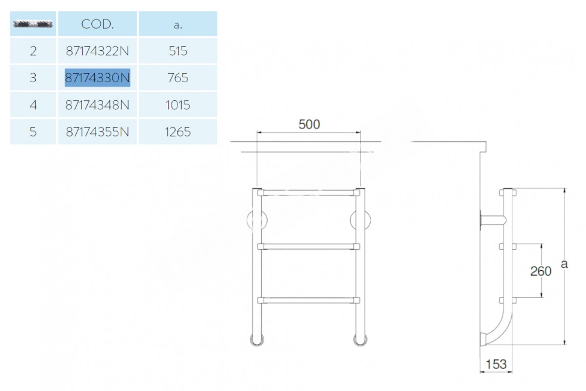 1 штСостоит из трех ступенек с противоскользящими пластиковыми накладками. Она изготовлена из нержавеющей стали AISI-316, благодаря чему может быть установлена в бассейнах с морской водой. Крепление в стену фланцевое, снизу лестница упирается в стену бассейна через резиновые заглушки.