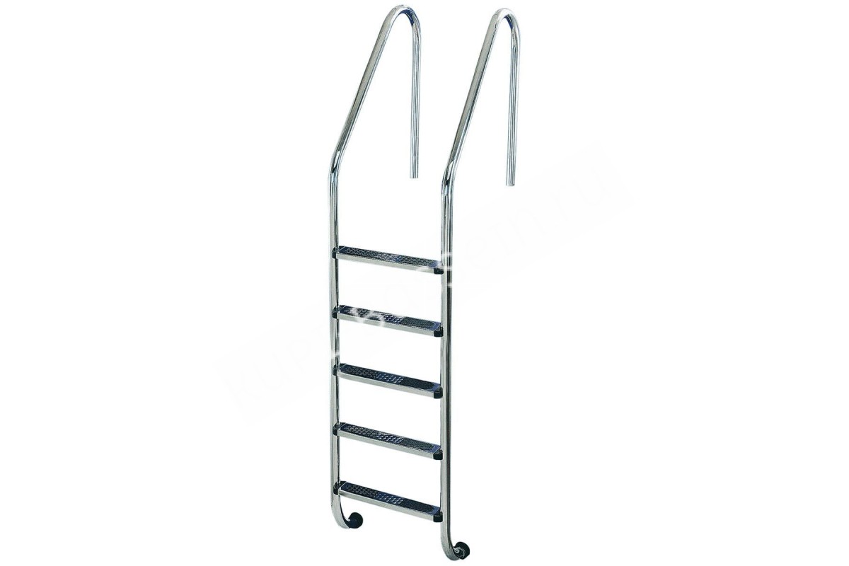 Лестница состоит из пяти ступеней, что обеспечивает легкий и комфортный вход в воду. Каждая ступень имеет специальное антискользящее покрытие, что значительно повышает безопасность при использовании. Это особенно актуально для детей и пожилых людей, которые могут испытывать трудности при спуске или подъеме. Удобные перила лестницы также способствуют дополнительной безопасности, позволяя держаться за них во время входа и выхода из бассейна.