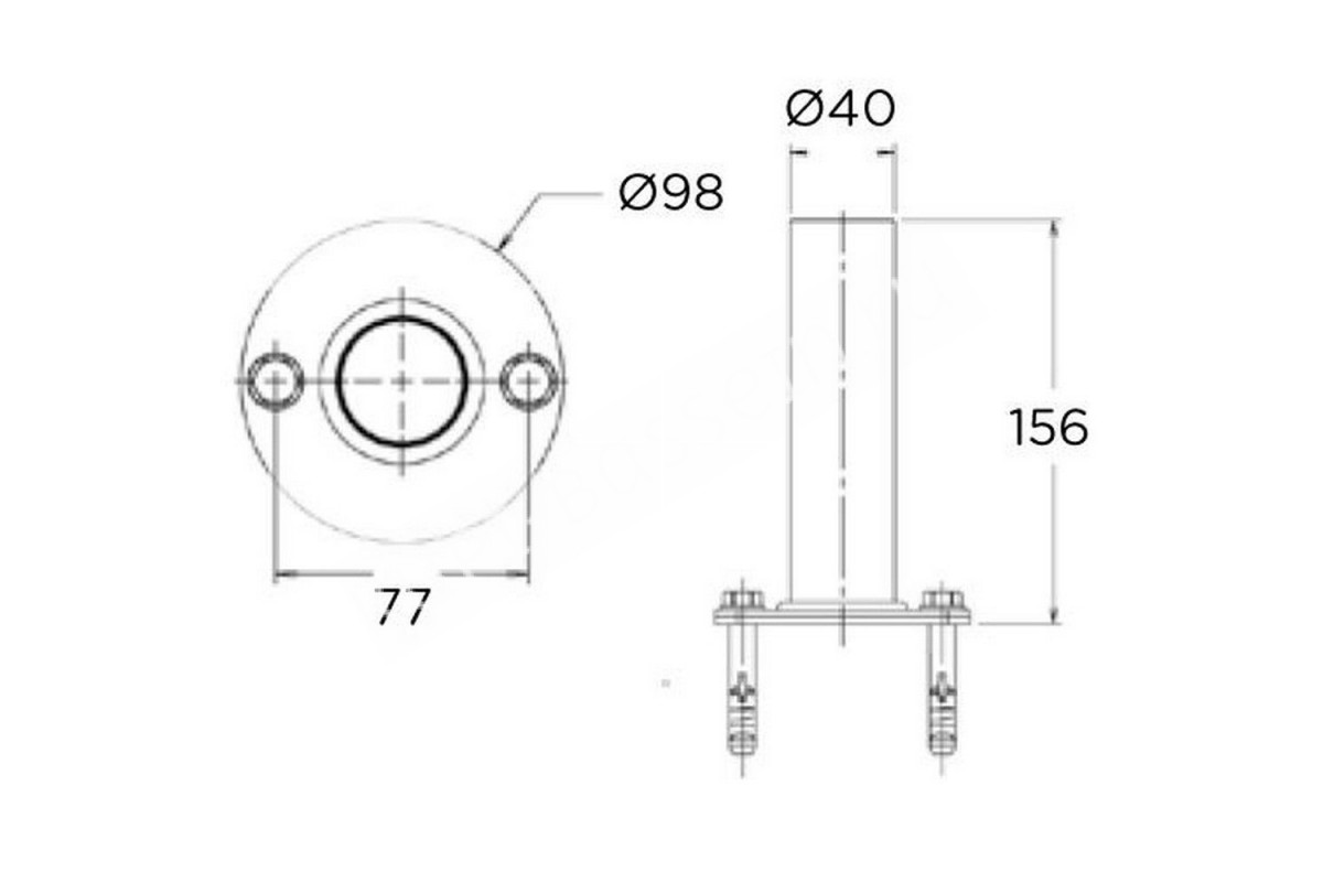 Место установки: борт бассейнаВысота анкеров: 156 ммДиаметр подошвы: 98 ммВнешний диаметр трубы: 40 ммРасстояние между крепёжными болтами: 77 мм