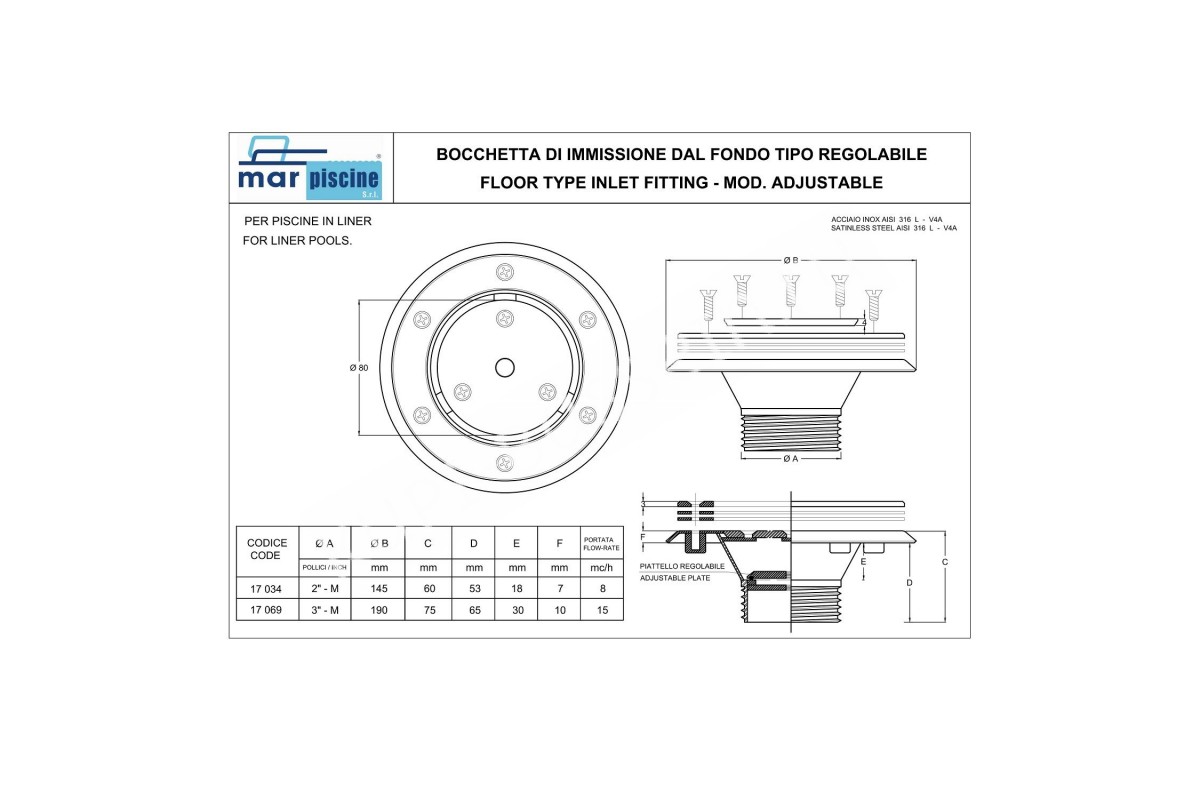 Форсунка донная под лайнер Marpiscine 17034 (2 дюйма) из нержавеющей стали - это идеальное решение для обеспечения эффективной циркуляции воды в вашем бассейне. Этот высококачественный продукт предназначен для установки на дно бассейнов, облицованных лайнером, и обеспечивает надежную работу системы фильтрации и очистки воды.